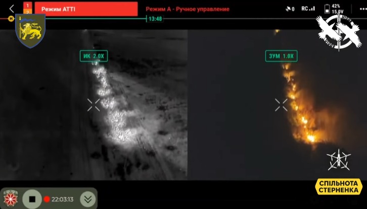 Σε ένα βίντεο, μια ουκρανική ταξιαρχία έδειξε πως ένα drone ρίχνει σε ένα άλσος καμένο θερμίτη, ένα μείγμα που αποτελείται από μια πυροτεχνική σύνθεση που περιέχει οξείδιο του σιδήρου και αλουμίνιο. Το μείγμα καίγεται σε θερμοκρασία περίπου 2.400 βαθμών Κελσίου και σκοπός του είναι να βλάψει τόσο τον ρωσικό στρατιωτικό εξοπλισμό όσο και να καταστρέψει την προστατευτική βλάστηση.